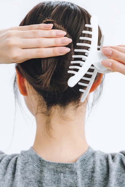 ねじり上げた毛束をお団子状にまとめたら、上からクリップで挟む。お団子が崩れないよう、クリップは大きめが◎。
