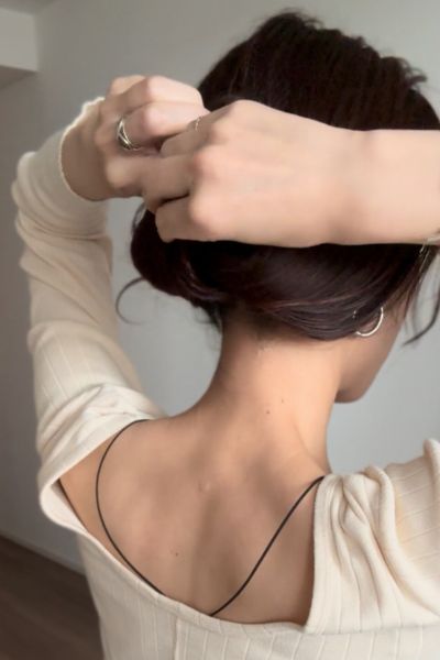 こだわり&お洒落見えをする変形お団子アレンジは、崩してラフ感も楽しめますが、うねりなどが気になりそうな日は崩さない方がベター。ラフ感を出さないことで湿気による髪ストレスも感じににくくなり、清楚に見せることもできます。髪は保湿をするとキレイに見せられるので、しっとりタイプのスタイリング剤は必須。