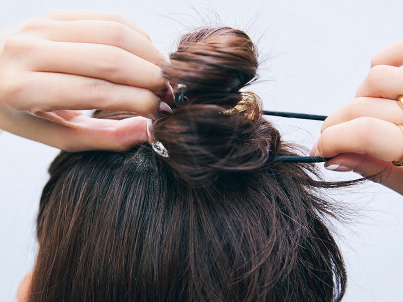 お団子の根元をゴムで数回結んで固定させる際、お団子の毛先でもうひとつお団子を作って一緒に結ぶ。小さいお団子がふたつできる。