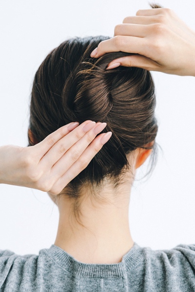 首の付け根の位置でひとつにまとめた毛束を、頭頂部に向かってねじり上げていく。毛がこぼれないようキツめにねじって。