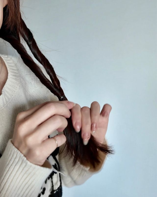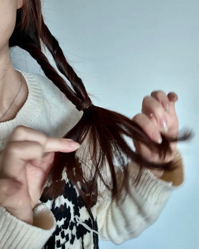 2.毛先を一緒に結び、ダブルのお団子に