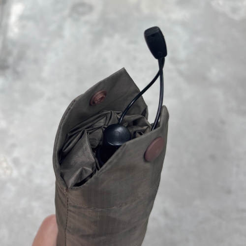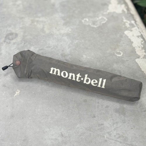 通常、収納ケースに入れる際は傘のハンドルが上ですが、モンベルの日傘はハンドルがケースの下に来るように収納します。