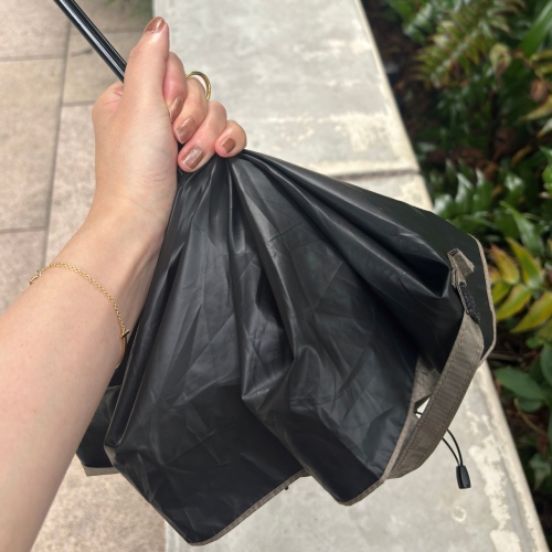 ハンドルから入れると、多少畳み方が雑でも、スルスルと入っていくのでとっても入れやすい。収納が面倒だった点が解決です!