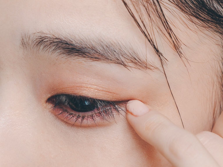 目尻側のラインがどうしてもきれいに引けなかったときは、ラインの先端を爪先を使ってぼかしてみて。これだけで先細なラインに仕上がります。目を開けた状態で行うのがポイントです。