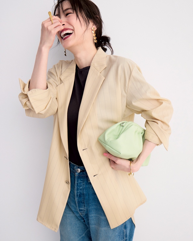 シャツ¥59,400(ノーブル 有楽町マルイ店〈ウジョー〉) Tシャツ¥11,000(ザハイライツ) デニムパンツ¥41,800(ボウルズ〈ハイク〉) バッグ¥37,400(リンク) イヤリング各¥31,900(マユ ショールーム〈MAYU〉) バングル¥86,900・ダブルリング¥42,900(リューク)