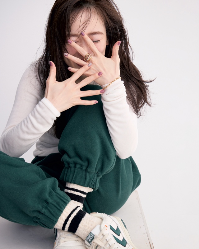 レイヤードトップス¥39,600(エイトン青山〈ATON〉) スウェットパンツ¥35,200(ATONSTAPLeS) スニーカー¥10,890(エスエスケイ お客様相談室〈ヒュンメル〉) ブレスレット¥308,000(ハルミ ショールーム〈オー〉)リング[L]¥154,000・[O]¥220,000・[V]¥264,000・[E]¥162,800(ビジュードエム六本木ヒルズ〈ビジュードエム〉) ソックス/スタイリスト私物