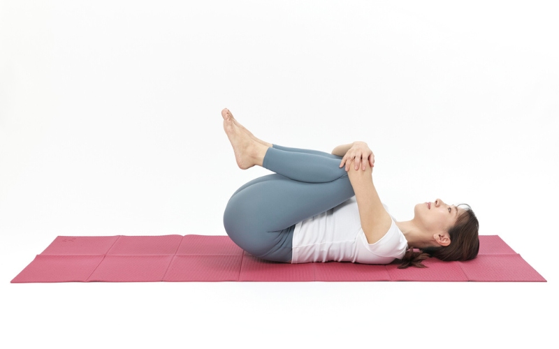 呼吸の妨げにならない程度に、優しくひざを抱えましょう。お腹が苦しい場合は、ひざを少し開いてもOK。〈回数:5呼吸~〉