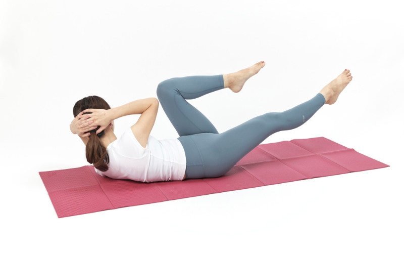 左ひざを曲げたら、足先を天井に伸ばしましょう。