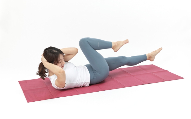 ▲頭を床から持ち上げて、へそをのぞき込むような体勢をとります。腰をさらに丸める意識で! 〈回数:5呼吸~〉