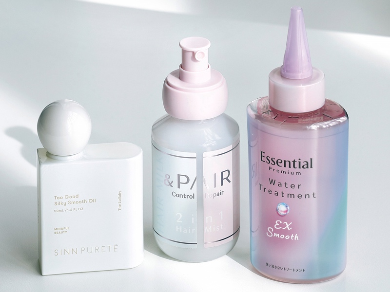 水分を入れて油分で蓋をするスキンケアと同じ感覚で、髪の保湿も〝工程〟を大切に。お風呂上がりの濡れた髪には、「エッセンシャル のウォータートリートメント」で潤いをチャージ。次はドライヤーの直前に、乾きを邪魔しないほどよいしっとり感の「アンドペアのミルクミスト」で保護。最後に、べたつかない軽さが気に入っている「シン ピュルテのシルキースムースオイル」で蓋をして完了です。