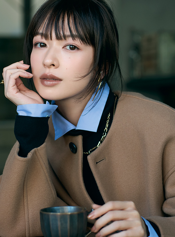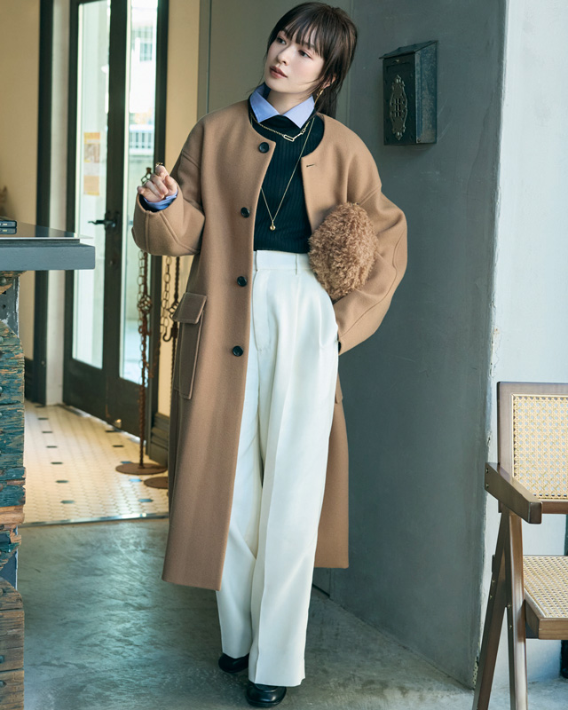 コート¥49,500(MIESROHE ルミネ新宿1店〈MIESROHE〉) ニット¥15,400・パンツ¥22,000(イネド) シャツ¥35,200(フィルム〈ダブルスタンダードクロージング〉) バッグ¥35,200(アンタイトル〈オルセット〉) 靴¥47,300(TOKEN〈L’unique et moi〉) イヤリング¥41,800・ネックレス[短]¥71,500・[長]¥39,600(ブランイリス トーキョー〈ブランイリス〉)