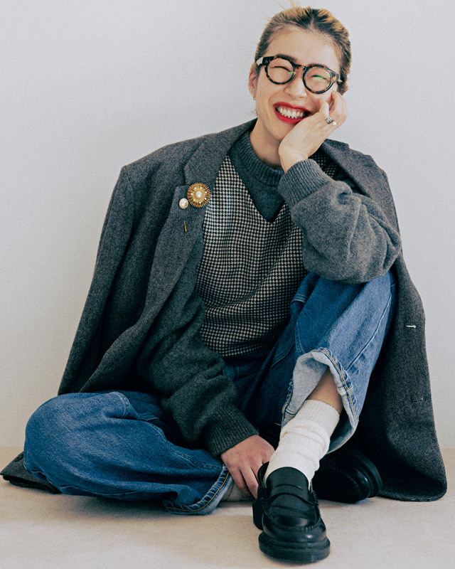ジャケット/UNIQLO ベスト/vintage ニット/IÉNA デニムパンツ/SHISHIKUI ソックス/NIRMATA 靴/Dr.Martens ブローチ/(左から)CHANEL、vintage リング(上から)/Bottega Veneta、Tiffany&Co.、no brand メガネ/MOSCOT