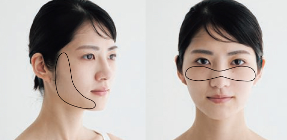 顔全体に美白コスメを投入するのが前提ですが、顔の中でも頬や鼻といった高い部分、日焼け止めが疎かになりやすいフェイスラインが、よりシミができやすいゾーンだと覚えておきましょう。