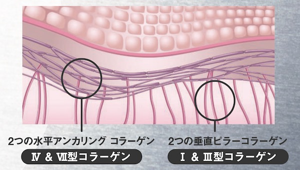 コラーゲンには種類があり、基底膜に存在してネットワークを形成するⅣ・Ⅶ型と、そのメッシュに固定されて肌構造を支えるⅠ・Ⅲ型の4種を生成することで、立体的なハリ構造ができる。