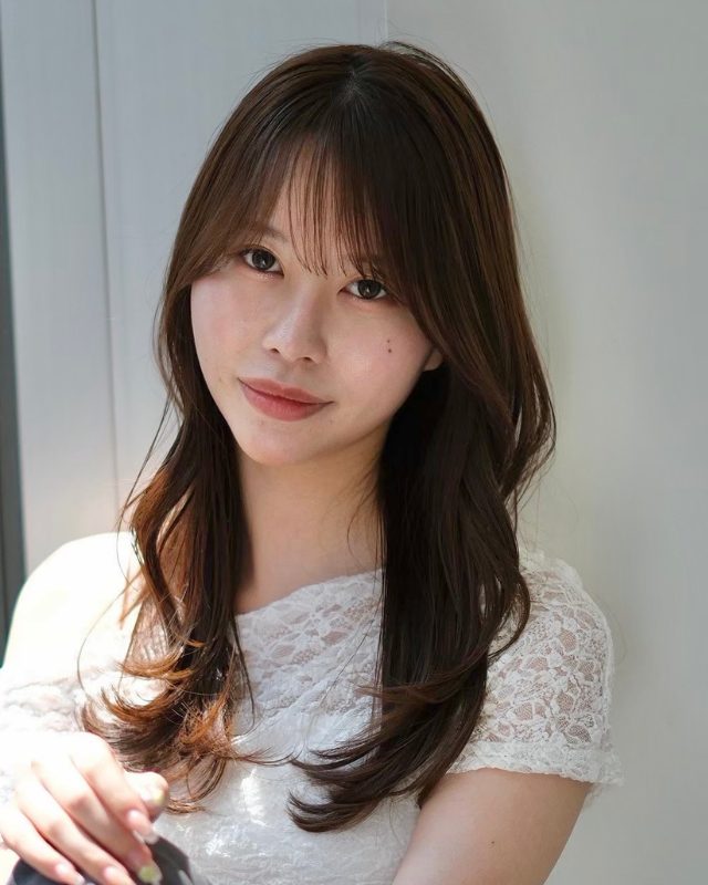 春っぽい抜け感バングを合わせたロングスタイルをご紹介します。顔周りを中心にレイヤーをしっかり入れるのがポイント。特に、フェイスレイヤーは顔の骨格に沿うように入れているため、さらっと巻くだけでもサマになり、小顔効果も望めます。
