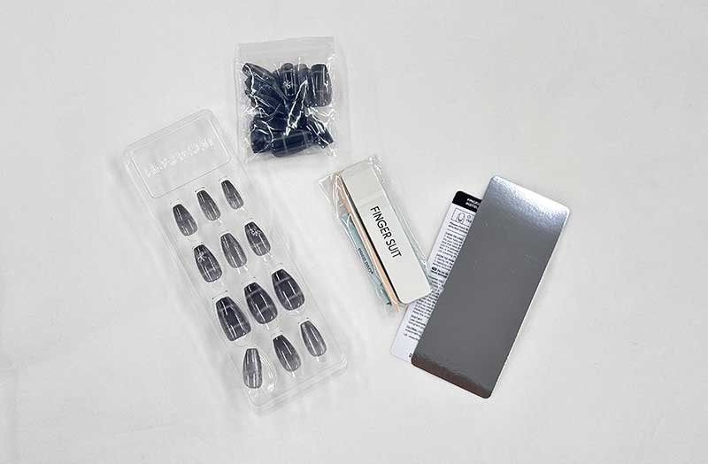 衣装が頻繁に変わるアイドルやファッション系の撮影現場で使用されるほど、その場で簡単に着用できるのが特徴。ネイルチップには接着シールがあらかじめ付着されていて、持続力を高めるプレップパッド、ネイルファイル、ウッドスティックなどが同梱されているので、新たに何かを買い足す必要がなくすぐにまるでサロン仕上げのようなネイルが完成!