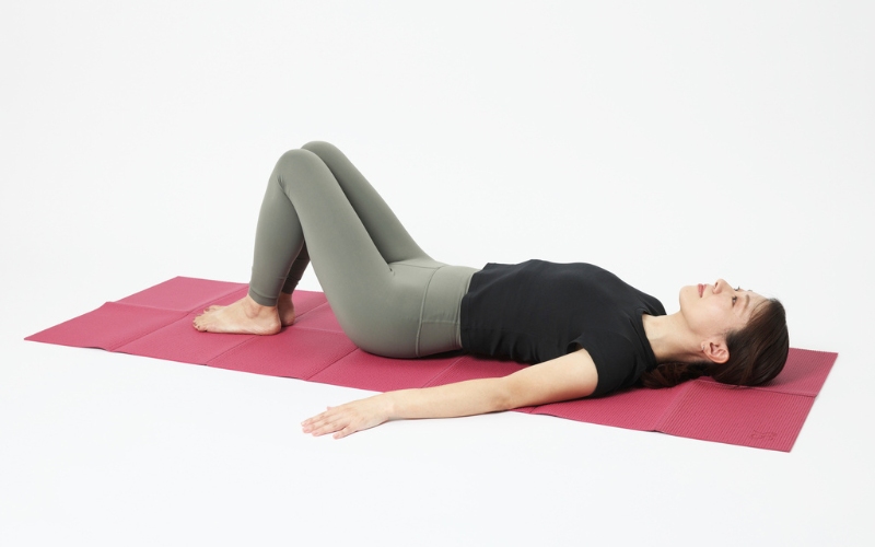 ポイント:呼吸に合わせて、足をゆっくり倒します。ひざが床につかなくてもOK! 無理のない範囲で動きましょう。