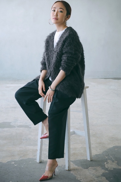 カーディガン¥27,940(ネイヴ) Tシャツ¥15,400(ボウルズ〈ハイク〉) パンツ¥23,980(アンクレイヴ〈アンクレイヴ ホワイト〉) ピアス¥8,400(アビステ) バングル¥13,750(フォーティーン ショールーム〈エイチアッシュ〉) 靴/本人私物