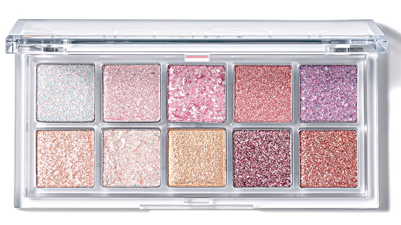 繊細なラメからザクザクなラメまで、たっぷりの輝きを帯びたピンク〜パープル系パレット。色も輝きも異なる多彩なラメを詰め込んだ、夢のようなカラーアイシャドウ。
