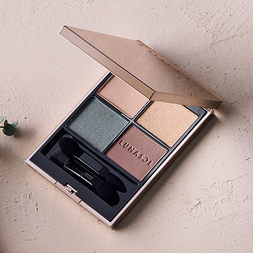 ゴールドの輝きを秘めたブラウンベージュカラーに、都会的なグリーンをアクセントに迎えた、スタイリッシュな配色のパレット。キメの細かいパウダーが、肌そのものを色づけるように発色。