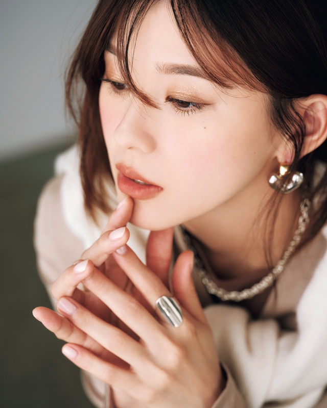 ベースのアイシャドウやチーク、リップはヌーディに統一。ヌーディカラーになじみやすい、ザクザクラメがたっぷりと入った白アイシャドウを、まぶたに指でラフにのせる。