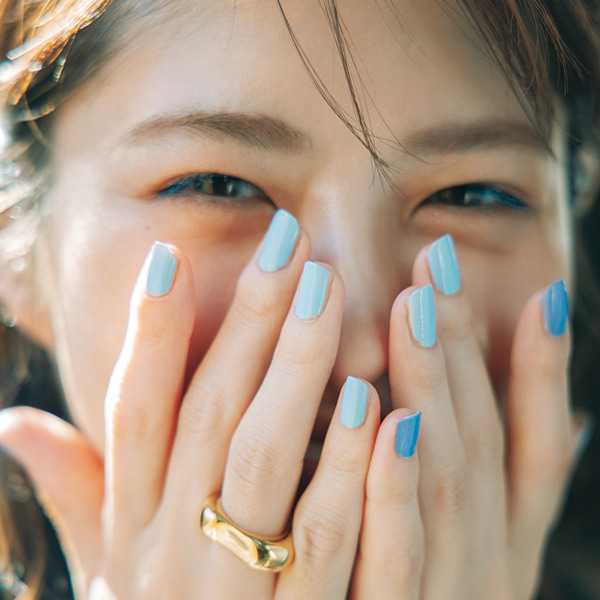 色味の異なるブルーを塗り分けたネイル。澄んだ発色とつるんとした光沢感あるネイルなら、上質で洗練されたお洒落な手元に。お顔もブルーのカラーメイクで統一し、可愛さの中に自立した美しさを際立たせて。