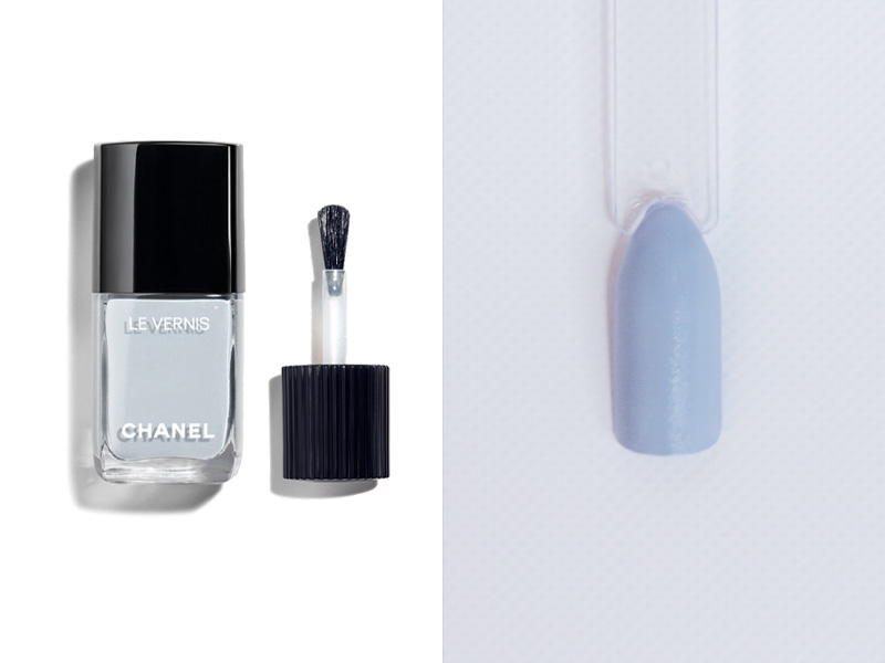 白っぽ寒色カラーのシンプルネイル。上品カラーではベージュメイクのコンサバ感が途端に色濃く見えてしまうから、冬はこんなハズしカラーを選びたい。