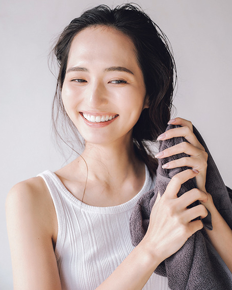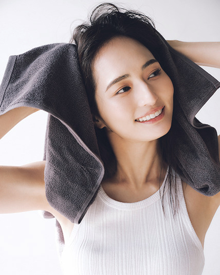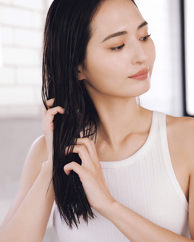 濡れた状態の髪はデリケート。毛先は絞るように。上部は〝ぽんぽん〟と空気を含ませるようタップして水分をオフ。