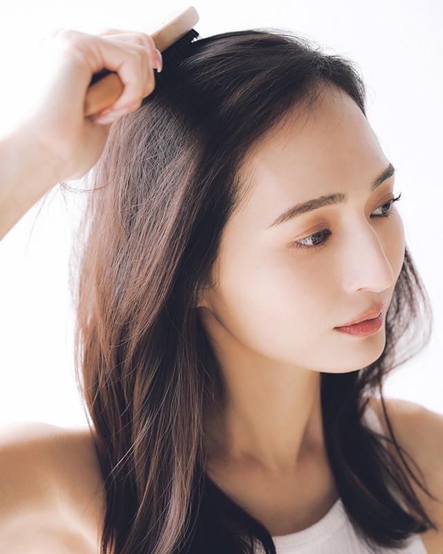 頭皮に心地よい刺激を与えるクッションブラシを使用。毛先の絡まりをほどいてから、地肌に沿うように前から後ろへ満遍なくとかす。