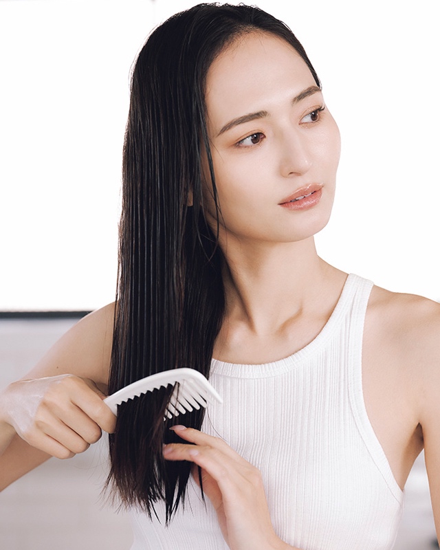 仕上がりに大きく差をつけるのはこの工程。目の粗いインバス専用コームで毛先を中心に全体をとかし、ムラなくなじませる。少し置いたら入念に洗い流して。