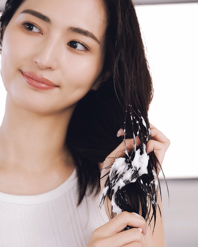 頭皮への直塗りは、シャンプーの過剰使用や洗い残しの元凶。ロングなら2プッシュとり、まずは毛先によく揉み込む。予洗いが足りていないと泡立ちにくい。