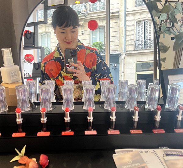 今回は、「着物の着付けサービス・お好きなリップ1つ」で60€のサービスに参加しました。様々な色味のリップがあり、選ぶのに私もお友達も嬉しい悩み時間が……リップ選びのプロであるブティックのディレクターの方々にアドバイスいただいたのが「自分に似合いそうかを考えずに、直感でときめく色味をぜひ選んでください!」とのこと。