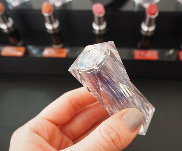 リップのケースにもときめいたのですが、螺鈿(らでん)という貝の装飾、切子のようなカッティングをイメージして作られたものだそうです。日本のお姫様の口紅は美しい貝の中に入っていたことをインスピレーションに、このようなデザインにされたのだとか。光に当てると、薄紫のような淡いピンクのような…繊細で絶妙な色味に煌めきます♡