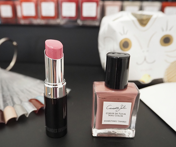 ブティックを改めて取材させていただいた時に、ネイルをしていただきました。青みがかったピンクのリップに近い「SHAKUYAKU TANREI」という色は上品でこっくりとしたカラー。日本の四季がインスピレーションのネイルは、一つ一つの色が絶妙で繊細な発色なのが魅力的。
