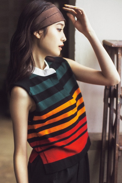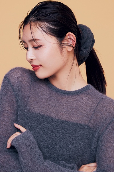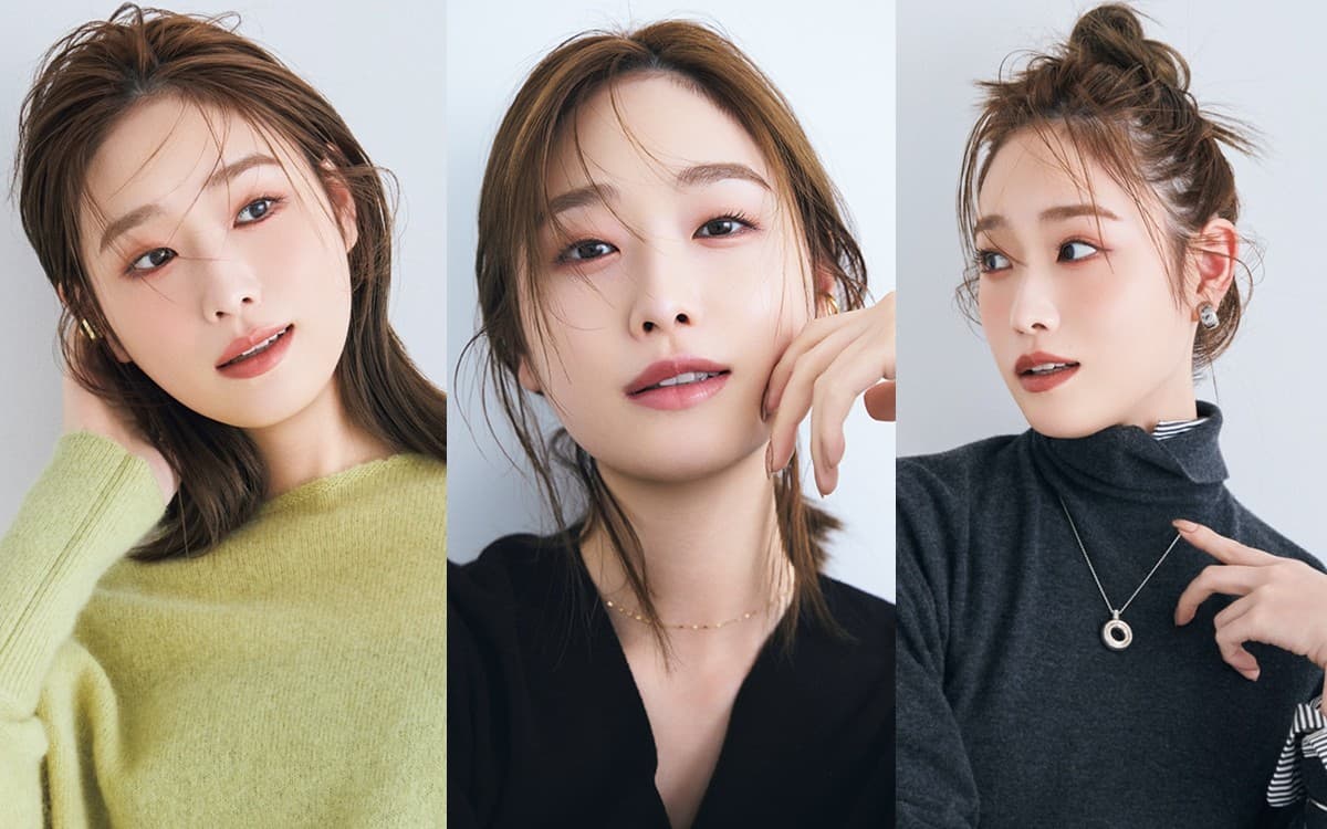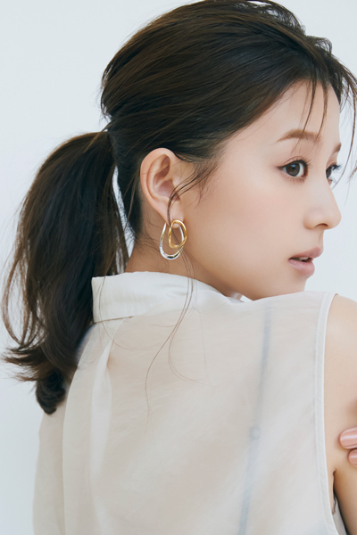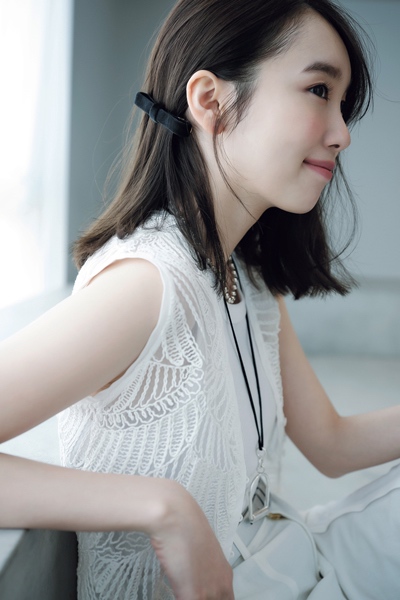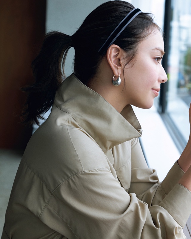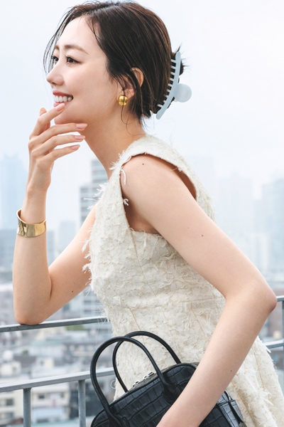 襟足で髪をお団子にし、毛先をバンスクリップで後頭部にまとめたシンプルなスタイルもサマになる。