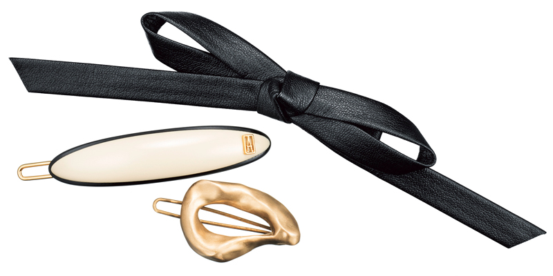 かわいらしいリボンでも、黒×直線フォルムならキレがよく大人っぽくまとまって。サイドをまとめるピン代わりに。