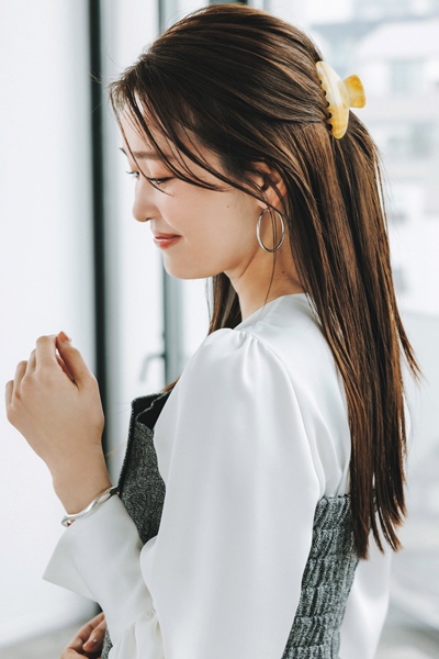 小さめのクリップなら、ハーフアップでまとめるアレンジにも使える優れもの。ゴムよりニュアンスが出て、髪に跡が残りづらいのもGOOD!