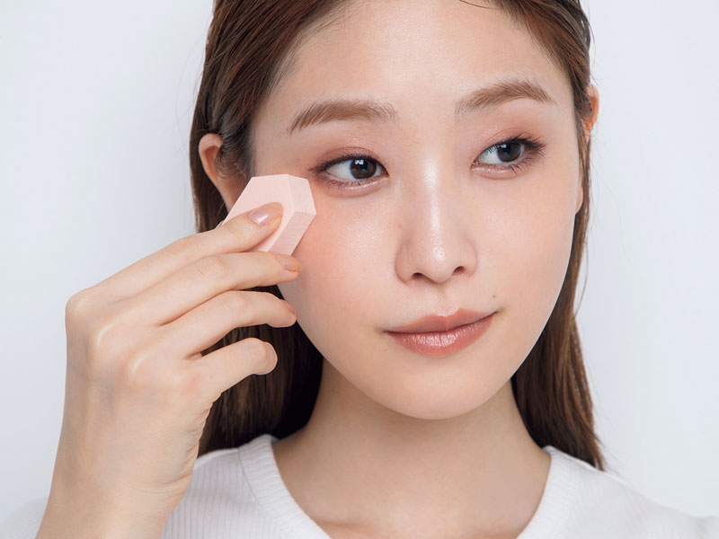 スポンジにハイライター(1)の左をとり、黒目の端から外に向かって楕円を描くようにぼかす。step1の逆三角形に少し重ねるようにして頬の立体感に奥行きをつくる。