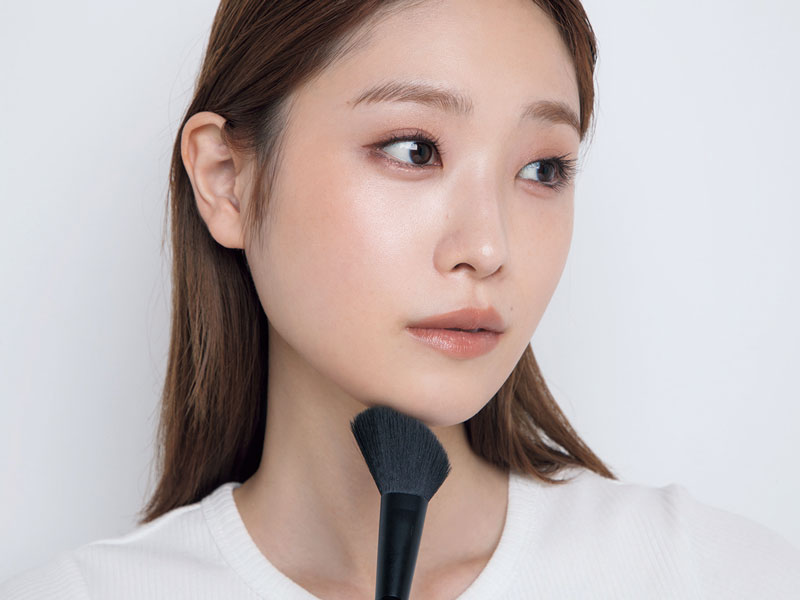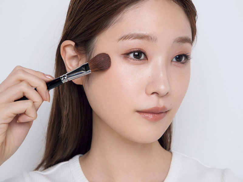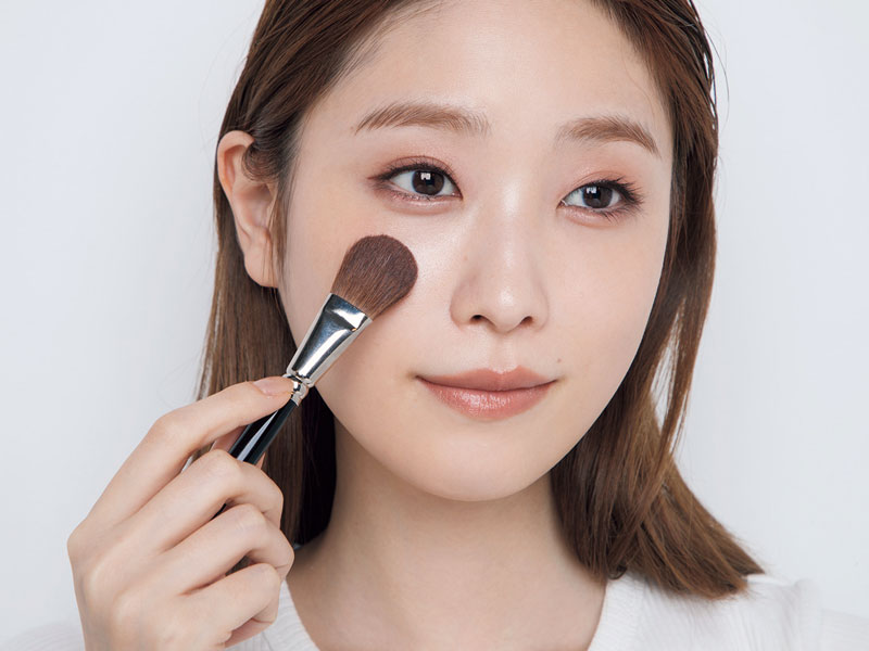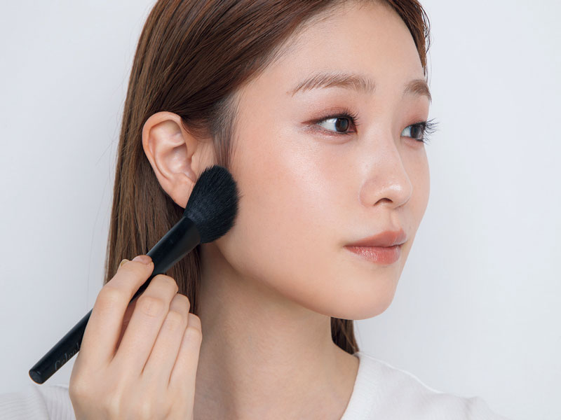 step3のチークを起点にブラシを輪郭に向かって動かし、放射状にチークを塗り広げていく。このとき、チークをこめかみまでぼかしすぎないように注意して。