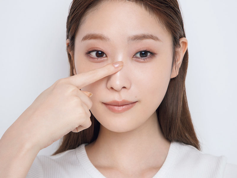 鼻の付け根あたりにも指でハイライター(1)の右を縦に2cmほどなじませていく。顔の中心に光を集めることで、視線が輪郭に向かうのを避ける効果あり。