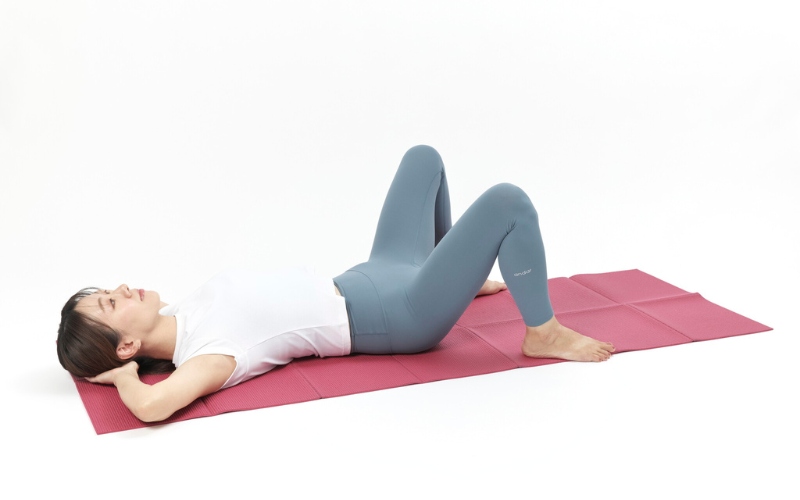 頭の下で手を組んでもいいし、姿勢がツラい場合は腕を体側に下ろします。